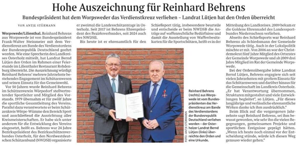 Herzlichen Glückwunsch lieber REINHARD BEHRENS zum BUNDESVERDIENSTKREUZ, das dir heute von unserem Landrat Bernd Lütjen ausgehändigt wurde. Hiermit wird unserem langjährigen Präsidenten und jetzigen Ehrenpräsidenten unseres Bezirksschützenverbandes Osterholz Anerkennung, Dank und Wertschätzung für sein ehrenamtliches Engagement seit 1975 (!) ausgesprochen, davon 24 Jahre als Präsident! Darüber hinaus war er viele Jahre Schiedsmann der Gemeinde Worpswede. Herzlichen Dank auch für die jahrzehntelange sehr angenehme und schöne Zusammenarbeit sowie so manchen Plausch. Weiterhin alles Gute und GUT SCHUSS „